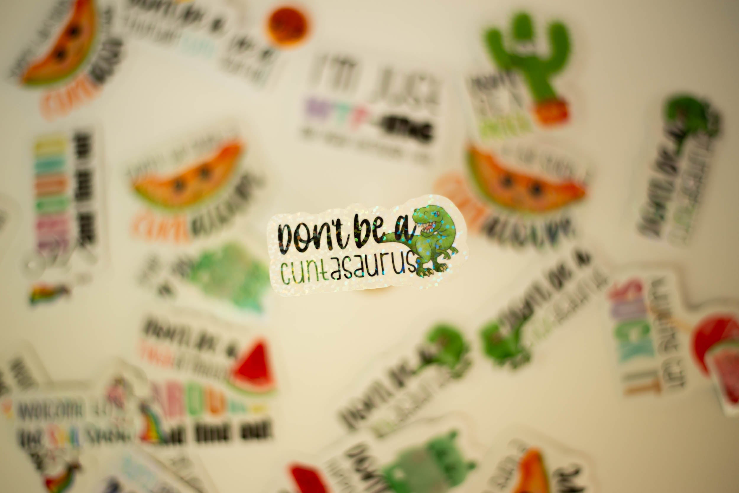 Adult sticker with words Dont be a Cuntasaurus. This is a high quality printed sticker overlayed with a protective UV film, all machine cut for a professional look.