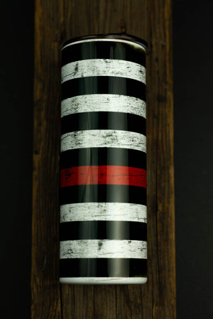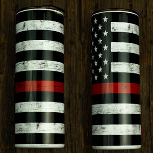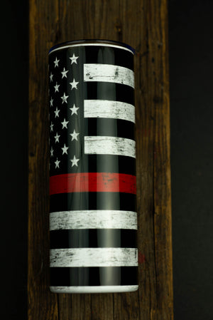 Thin red line American flag supporting firefighters. The perfect cup for those in the line or that supports our firefighters. This cup has features an edge to edge look with a really nice printed look. Directly printed onto the metal for a longer lasting finish. Comes with a lid and plastic or stainless steel straw.
