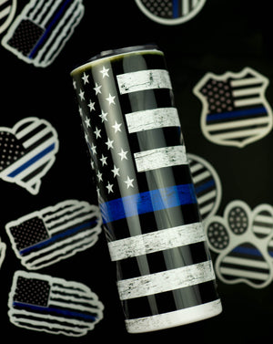 Cup features an American flag with a thin blue line in support for police on a rustic style print. Printed directly on the metal for a longer lasting finish. Comes w/ straw and lid. (Props not for sale).All cups can have custom text in select fonts if requested upon ordering.