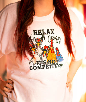 Relax, we're all crazy. Its not a competition. White t-shirt. printed directly onto the shirt for a longer lasting finish.