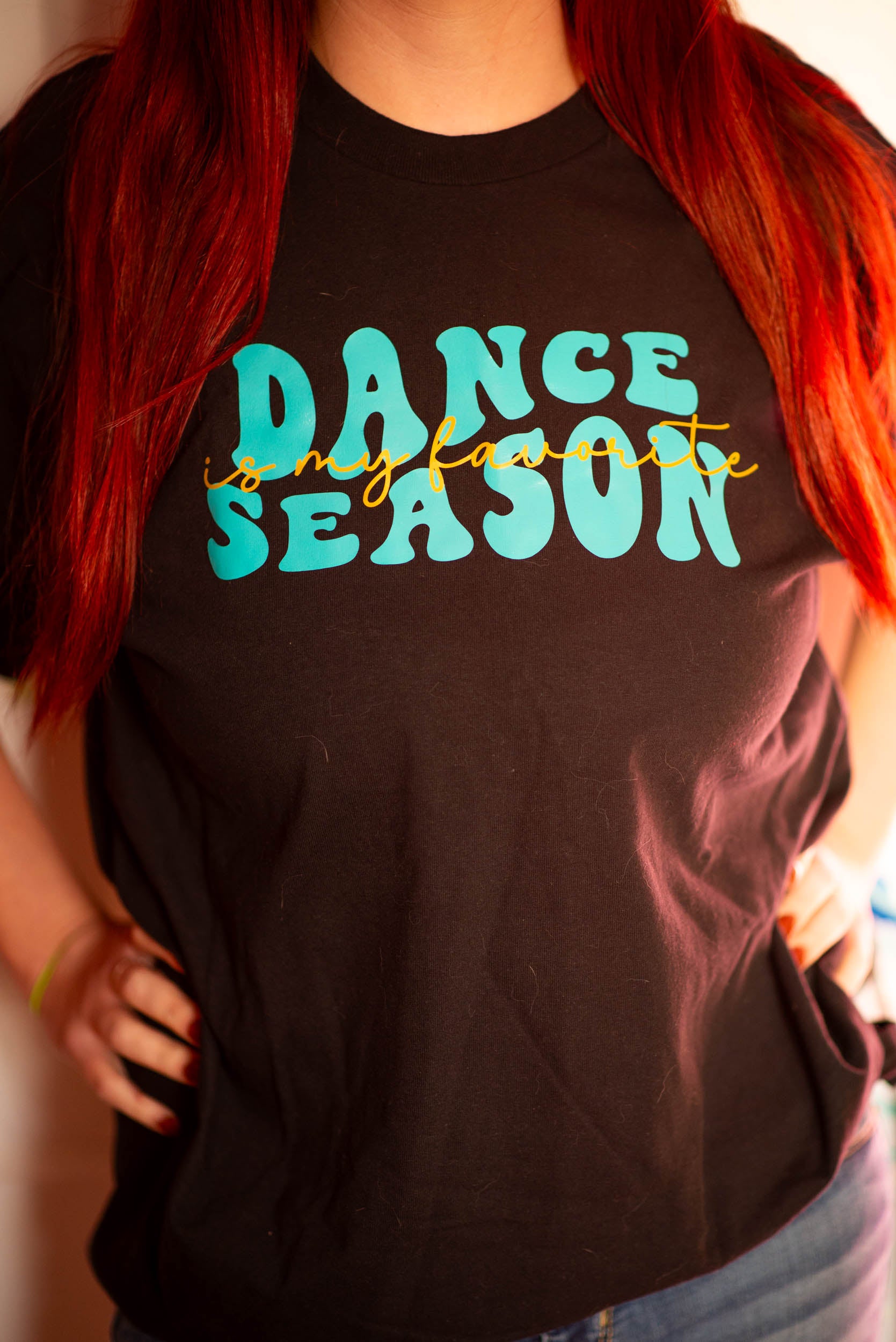Vinyl heat pressed t-shirt with words "Dance season is my favorite season" applied. Bright colors.