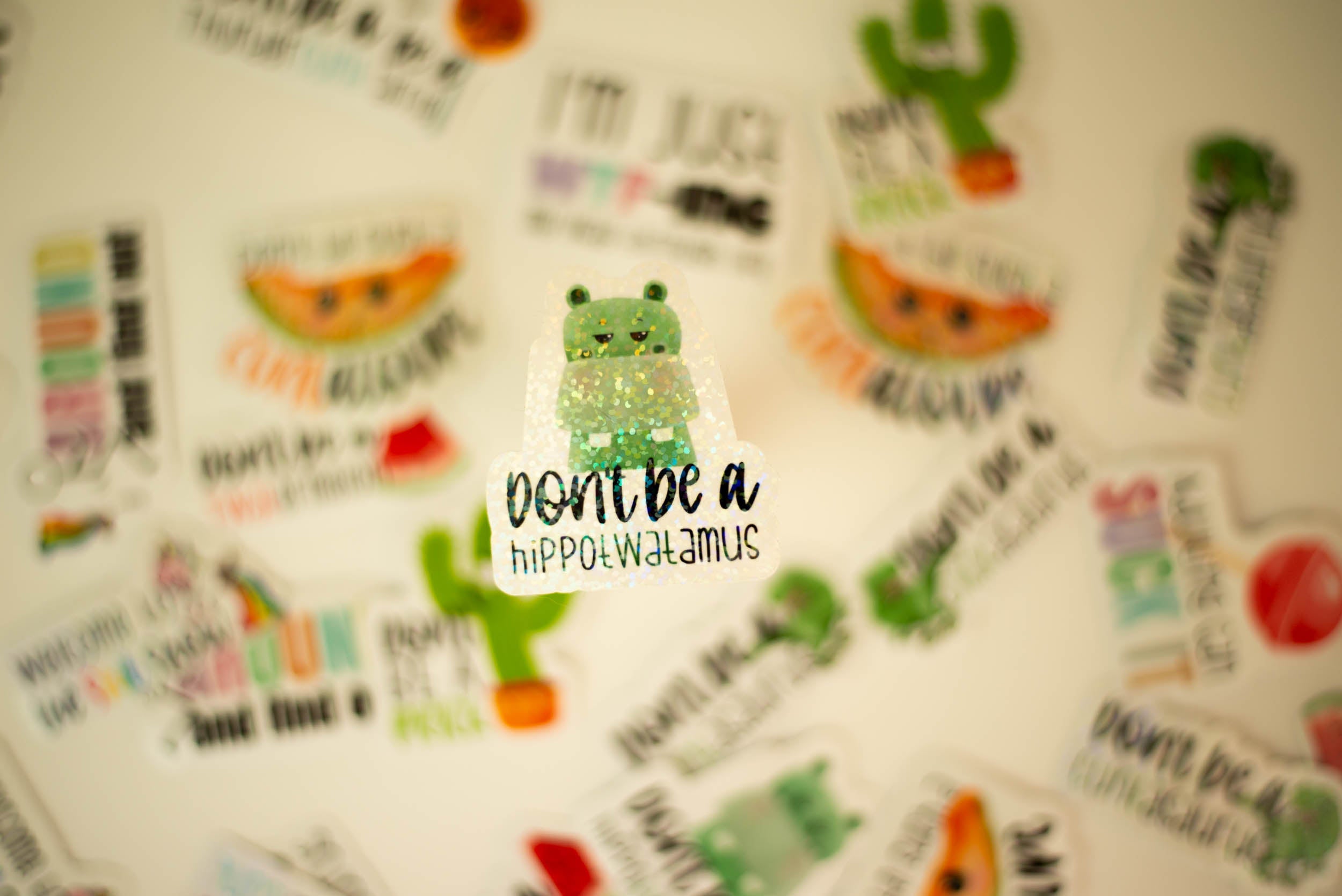 Adult sticker with words Dont be a Hippotwatamus. This is a high quality printed sticker overlayed with a protective UV film, all machine cut for a professional look.
