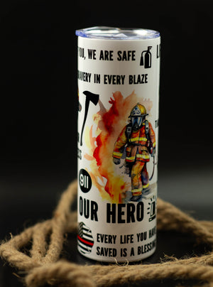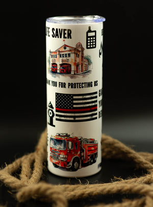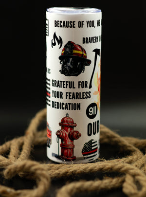 Stainless steel tumbler featuring firefighter walking near fire, American flag with thin red line, and other text. Image is printed directly on the metal for a longer lasting finish. Comes w/ straw and lid. (Props not included). All cups can have custom text in select fonts if requested upon ordering.