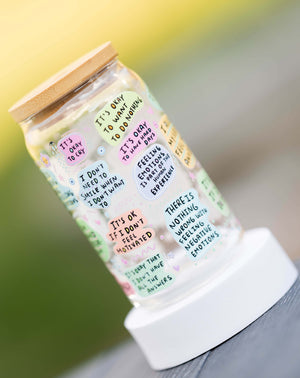 Glass cup w/ "My Mental Breakdown Cup" words, also has encouraging words throughout as support (see pictures), w/ lid. comes w/ straw. listing is for item only, props not for sale.