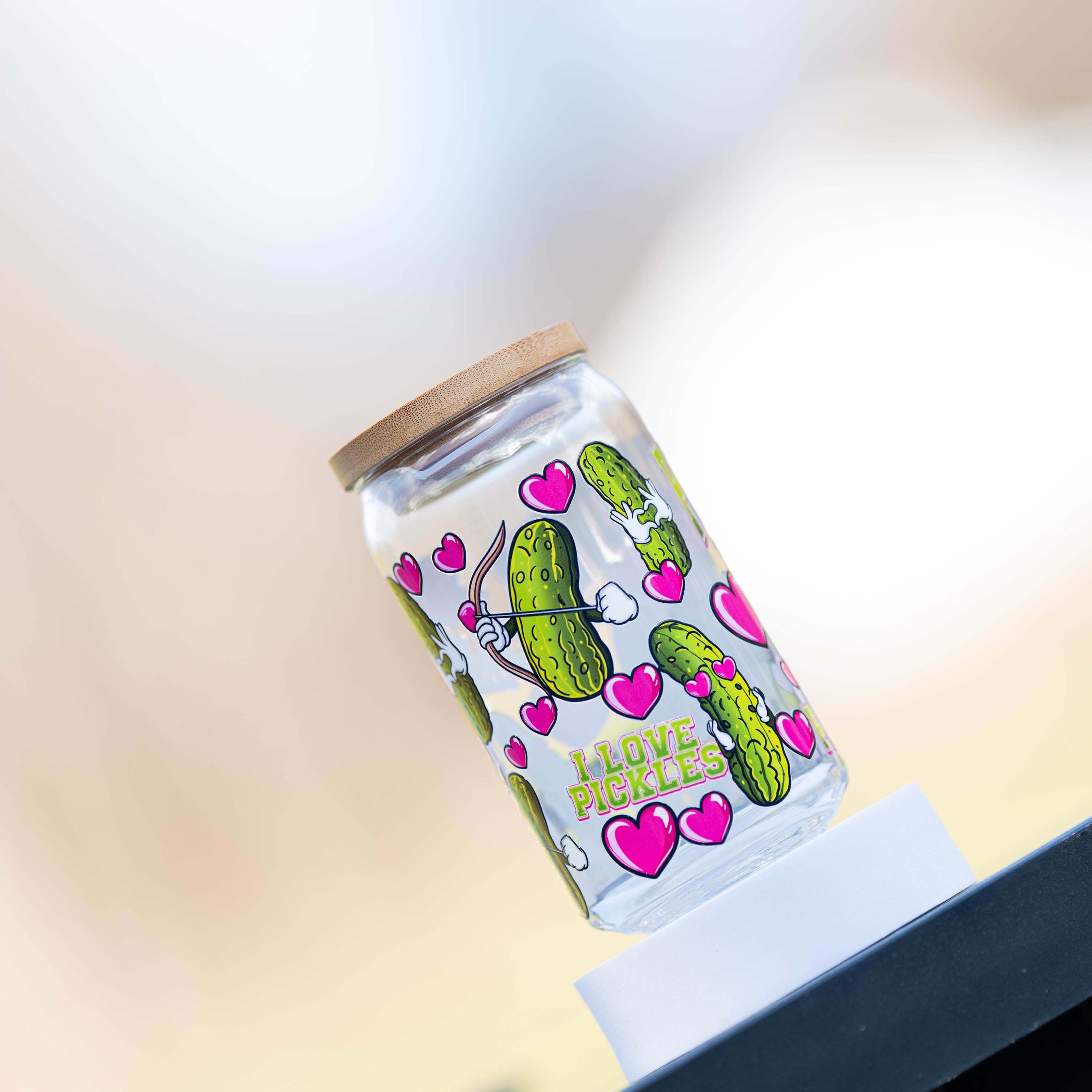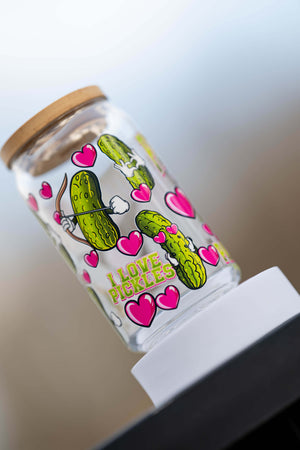 Glass cup w/ words Pickle Lover (see pictures), w/ lid. comes w/ straw. listing is for item only, props not for sale.