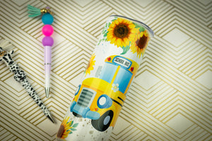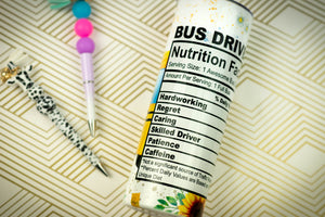 This cup features a school bus photo with sunflowers and bus driver nutritional facts including hardworking and other qualities. Cup is directly printed on metal for longer lasting finish. All cups can have custom text in select fonts if requested upon ordering. (Props not for sale). (Pens are for sale in a separate category)
