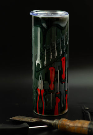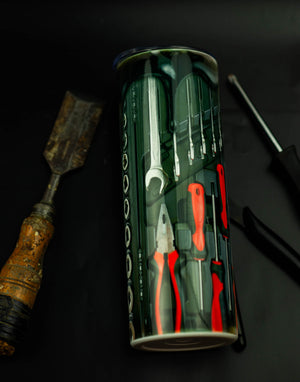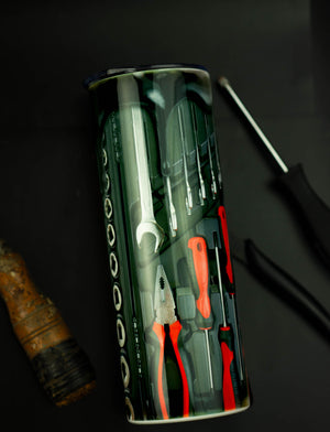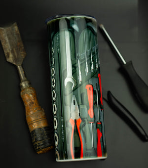 This cup features a print pattern of a tool box with wrenches, pliers, and other sockets. It is directly printed on the metal for a longer lasting finish. Cup comes with lid and straw. (Props not included).All cups can have custom text in select fonts if requested upon ordering.