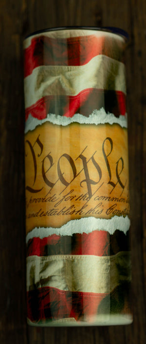 This tumbler features an American flag with a logo and a small part of the constitution reading "We The People". This is directly printed onto the metal for a longer lasting finish. Comes with stainless steel or plastic straws.